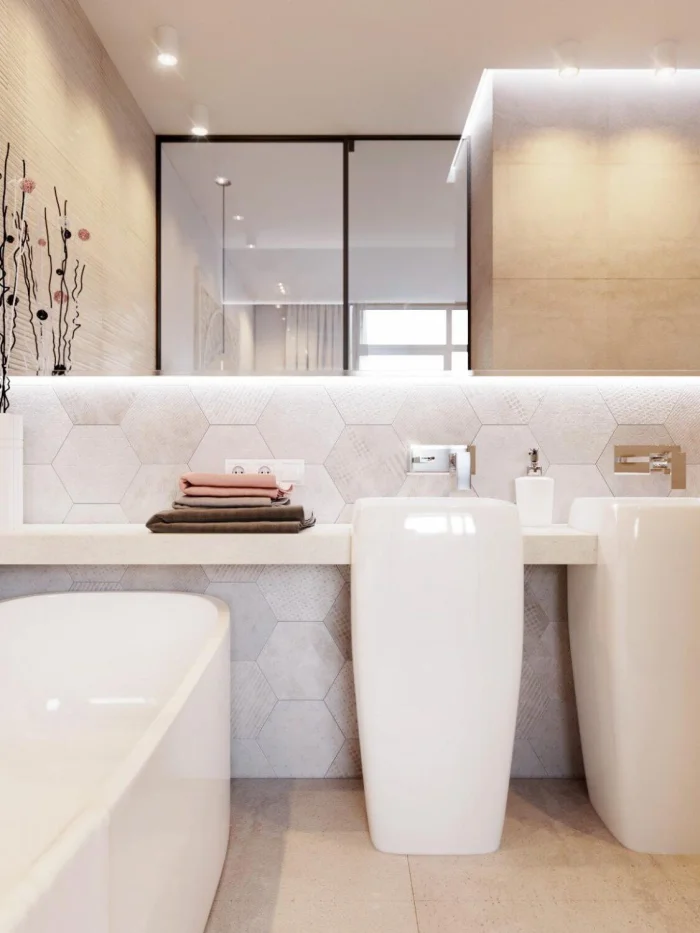 Экспериментируйте с формой: шестиугольная плитка, круглое зеркало в прямоугольной нише, треугольные полки. Именно такая игра создаёт тот самый «дизайнерский» лоск. Правильно собранный геометрический пазл, особенно в гармоничной цветовой гамме, — беспроигрышный ход.