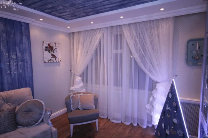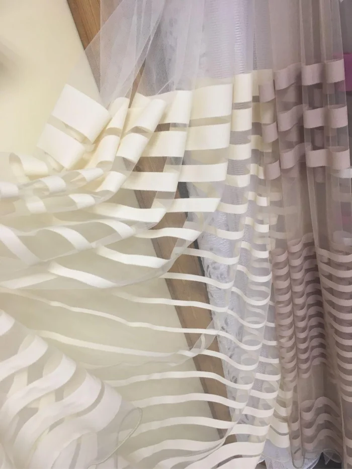 Для детской отлично подойдёт органза в неширокую полоску — нарядно, но не пафосно. Хорошо работает тандем из матового и глянцевого тюля одного цвета.