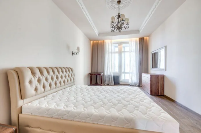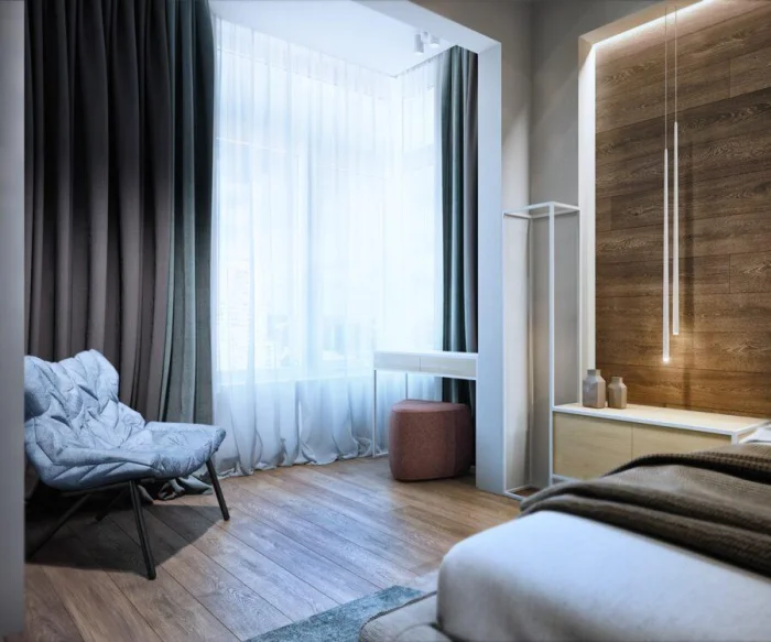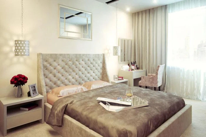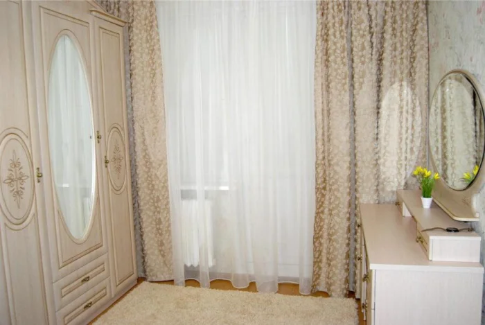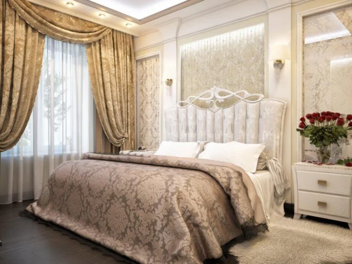 А вот от тканей с крупным 3D-эффектом в маленькой спальне лучше отказаться: они могут зрительно «съесть» пространство. Выбирайте пастельные оттенки с аккуратной вышивкой.