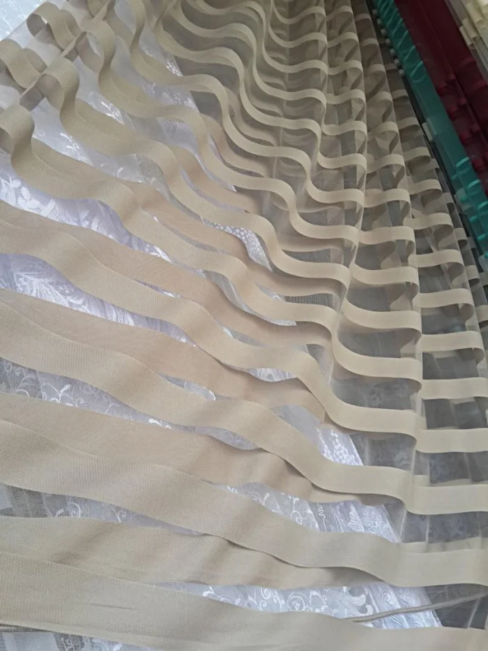 Тюль с вплетением атласных нитей (шёлк, полиэстер, хлопок). Идеально драпируется, создавая мягкие, переливающиеся складки. Смотрится роскошно, но не вычурно. Идеальный кандидат для оформления парадной гостиной.