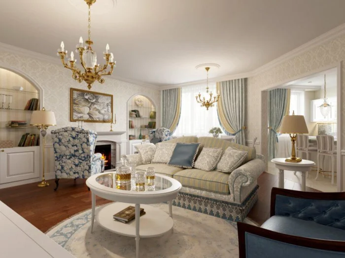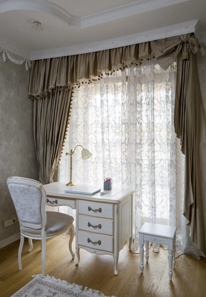 Отдельно стоит отметить неоклассику. Это направление предлагает универсальные, но очень выразительные решения, где тюль часто становится ключевым элементом.
