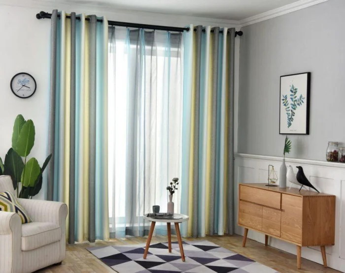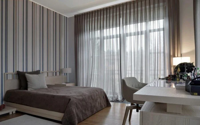 - Чтобы визуально поднять потолок, используйте тюль с вертикальной полоской.
