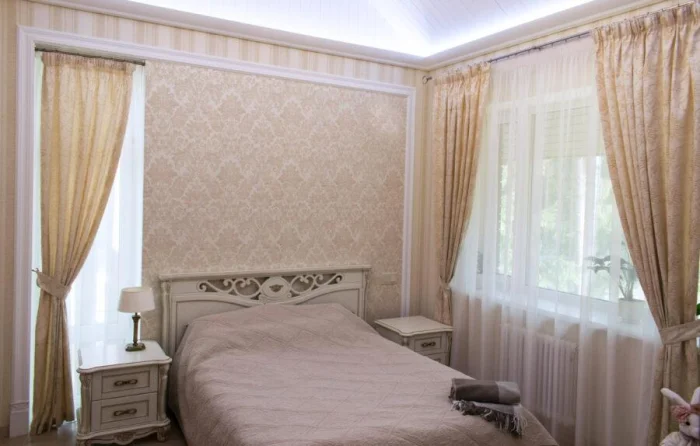 Белая вуаль или цвет шампанского — беспроигрышный вариант для спальни. Собранный в мягкие складки, он создаёт романтичное, расслабляющее настроение.