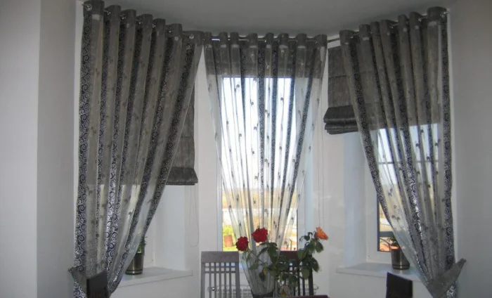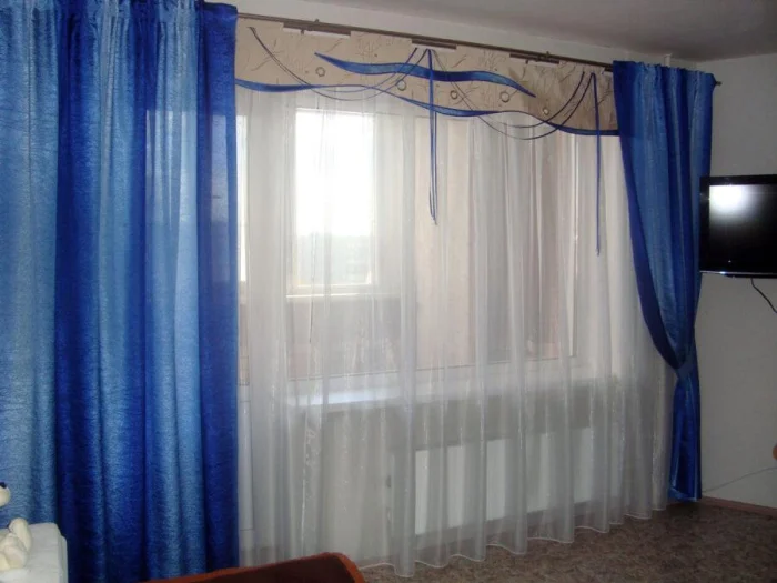Креативная идея: использовать тюль как фон для тёмных штор. Например, полосатая органза + однотонное плотное полотно. Тюль вешают ровно, а шторы драпируют и собирают в центре. Отлично работает с балконной дверью.