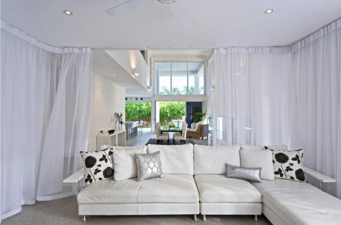 Белый тюль от потолка до пола — беспроигрышный приём для визуального расширения пространства.