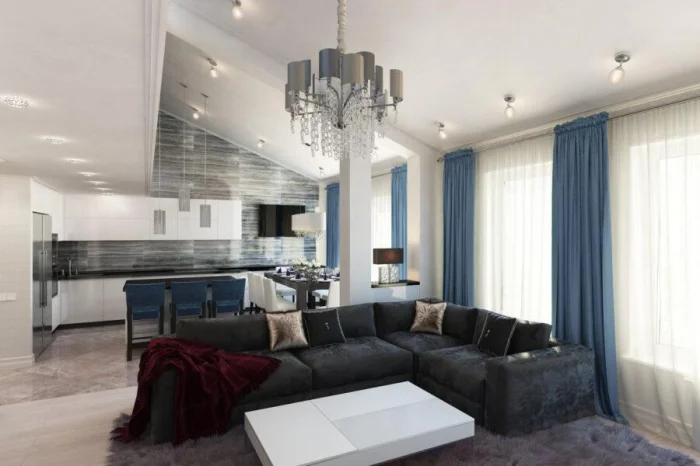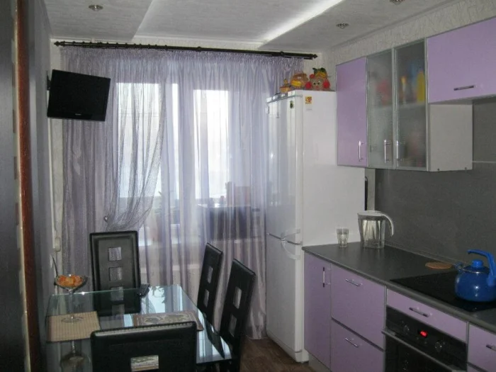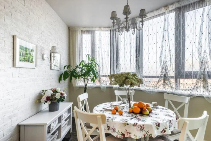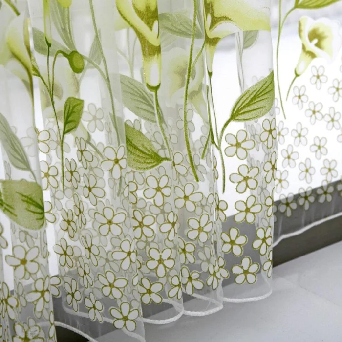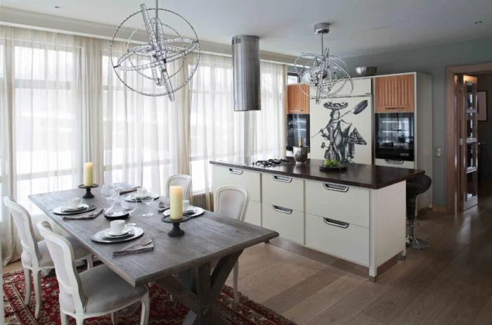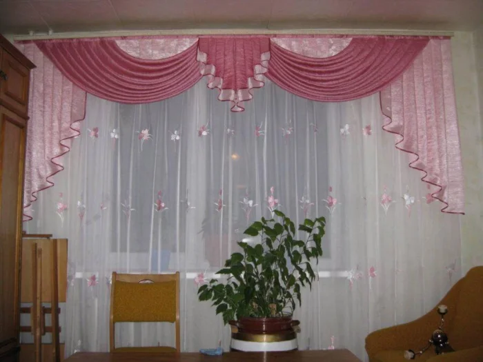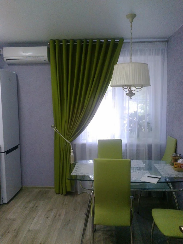 Для современной кухни-гостиной берите полупрозрачную органзу с матовым покрытием. Можно поэкспериментировать с кроем по косой и специальными держателями. А вот от атласа на кухне лучше отказаться: он быстро пачкается и сложен в уходе.