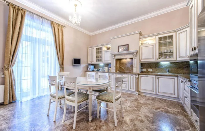 В просторной кухне можно установить карниз с несколькими рядами и играть с комбинациями разных тканей. Смотрится это невероятно эффектно и динамично.