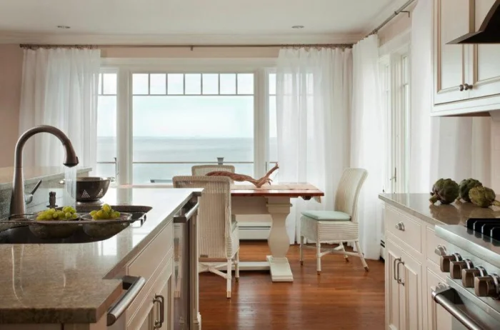 Кухня в 2023 тяготеет к скандинавской простоте. Здесь уместна практичная хлопковая сетка, простой крой, чёткие горизонтальные линии. Цвета — природные и спокойные: молочный, жемчужный, песочный, все оттенки серого. Интересно смотрится контраст воздушного тёмного тюля со светлой отделкой.