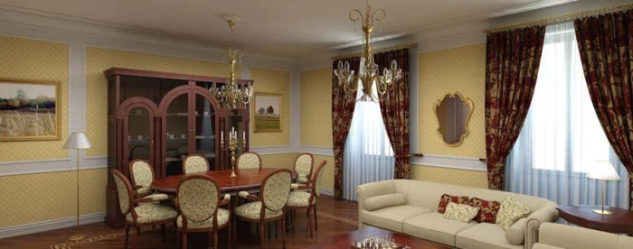 Классика требует сдержанности и гармонии. Тюль и плотные портьеры должны составлять единый ансамбль. Актуальные цвета 2023: сливочный, ореховый, приглушенный зелёный, все оттенки серого. А также: