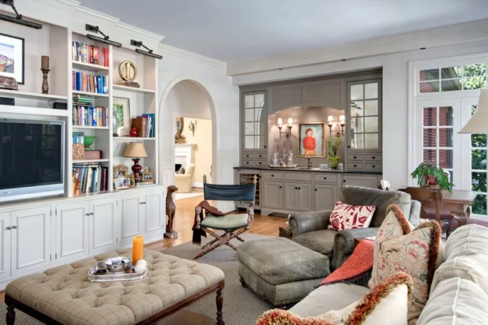 Если же у вас большая гостиная, можете позволить себе роскошь поставить основной комплект (диван, журнальный столик) в центр. А технику и системы хранения расположить по периметру.