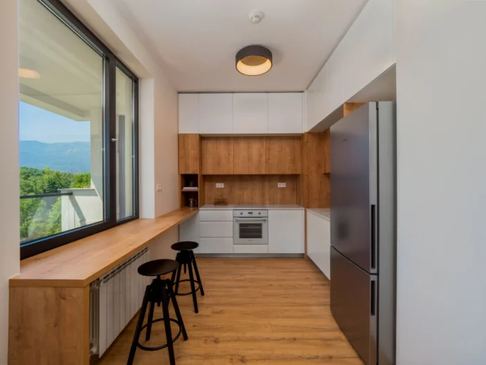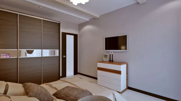 - Минимализм. Философия «ничего лишнего» — спасение для малогабариток. Четкие линии, скрытые системы хранения, монохромная или нейтральная палитра. Каждый предмет на счету и выполняет функцию.