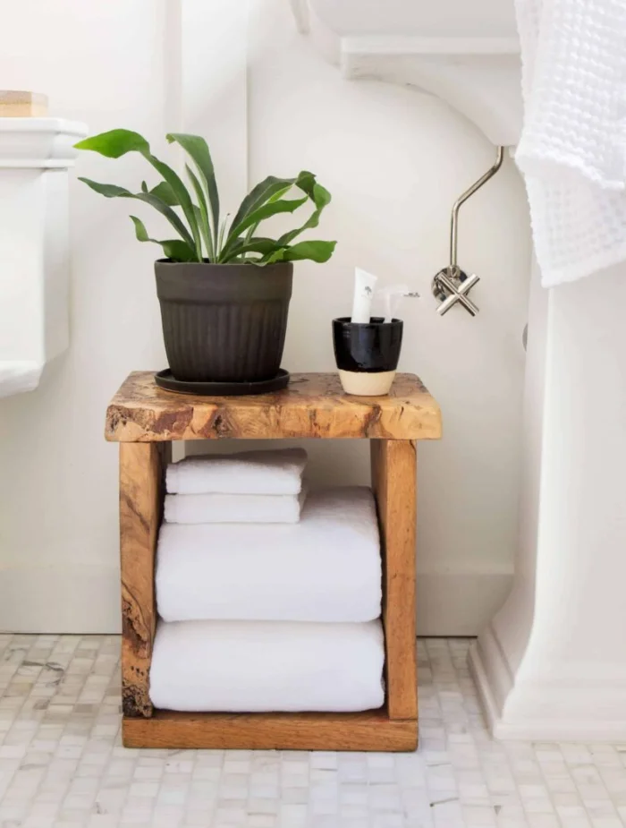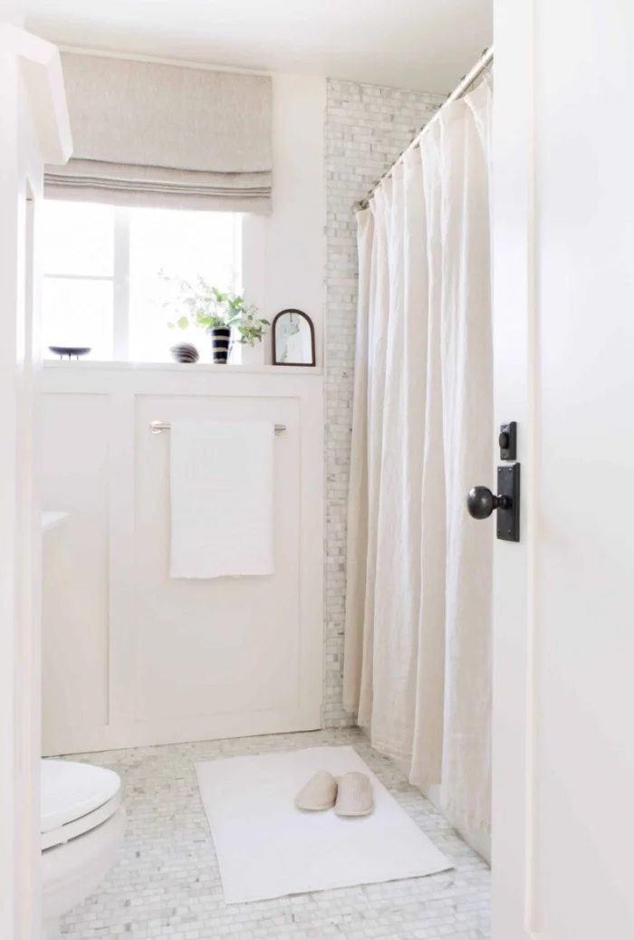 - Текстиль (полотенца, коврик, шторка) — добавляет цвет и уют.