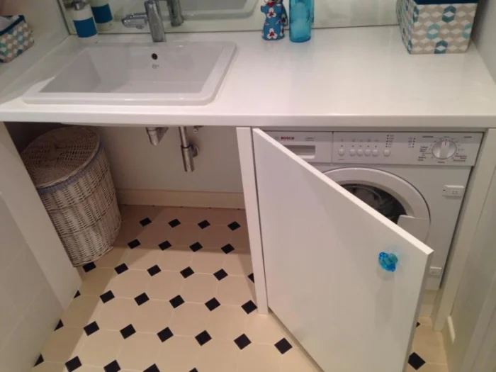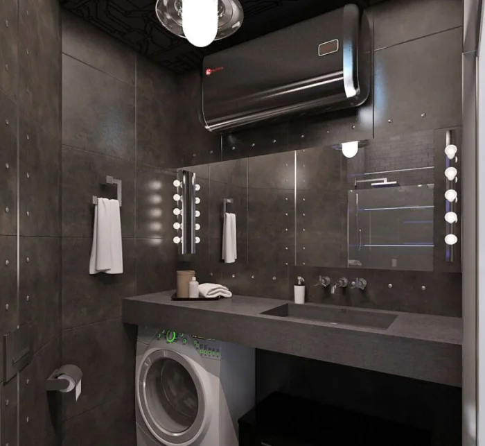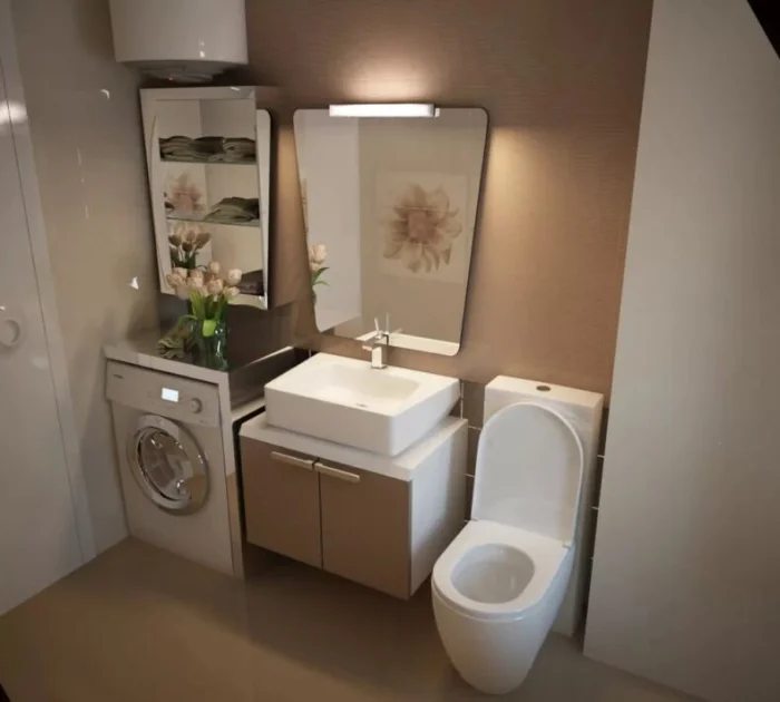 Раковину выбирайте компактную, лучше округлой формы (углы травмоопасны в тесноте). Стиралку можно спрятать под столешницу или выбрать узкую модель.