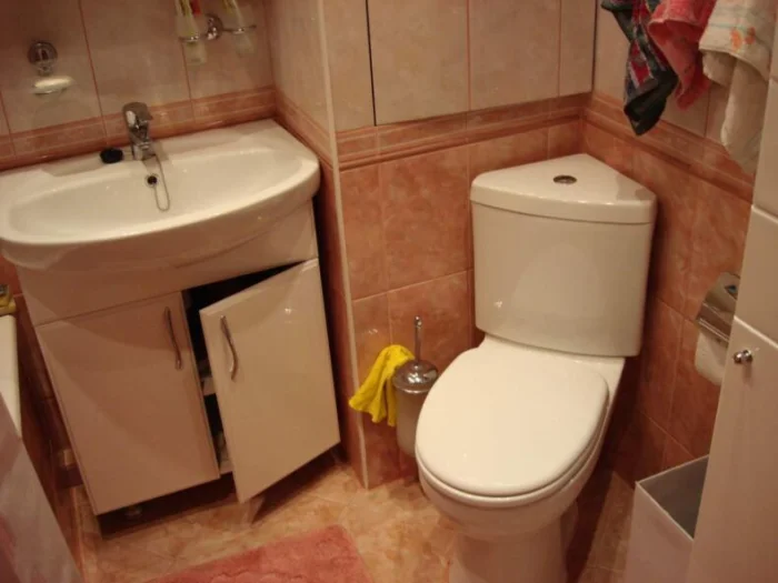 - Сносить ли перегородку? Если у вас раздельный санузел, подумайте — а так ли вам нужна эта стенка? Ее демонтаж — самый простой способ выиграть драгоценные сантиметры. На площади в 2 квадратных метра каждый из них на вес золота.