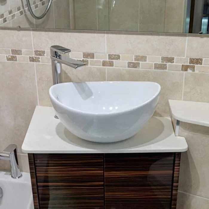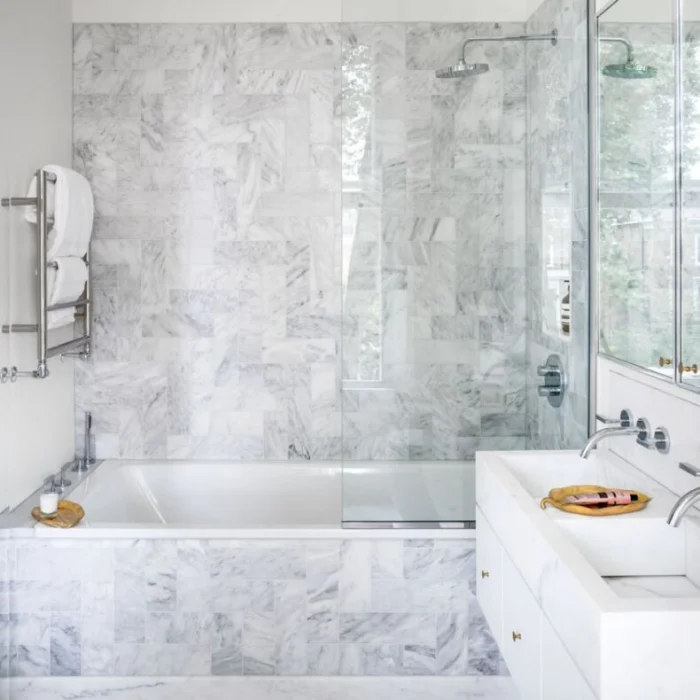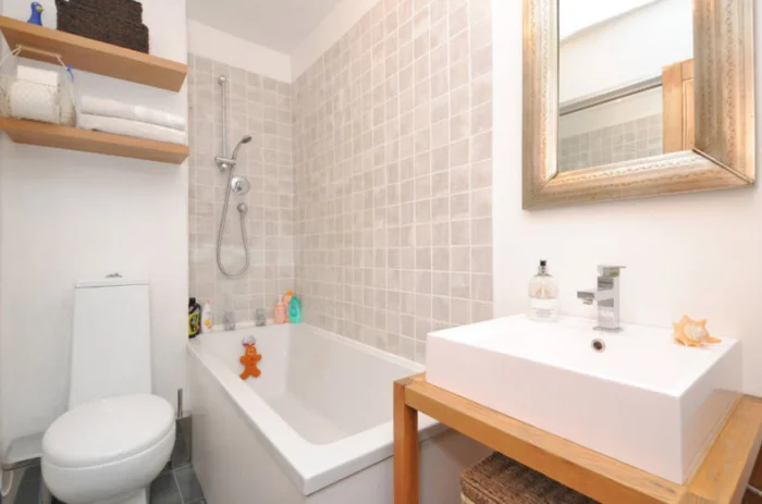 - Большая плитка вместо мелкой. Забудьте стереотип, что для маленькой ванной нужна только мелкая плитка. Крупный формат (например, 30х60 см) с минимальным количеством швов, наоборот, зрительно увеличивает пространство.