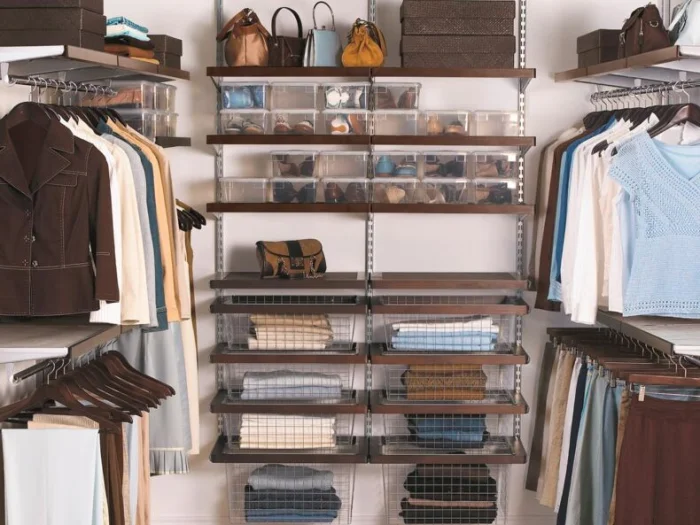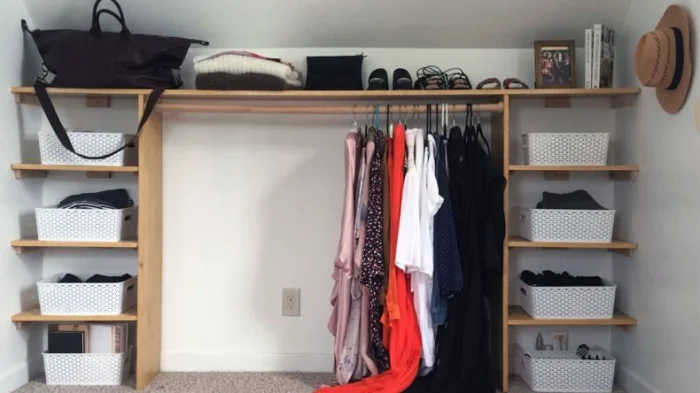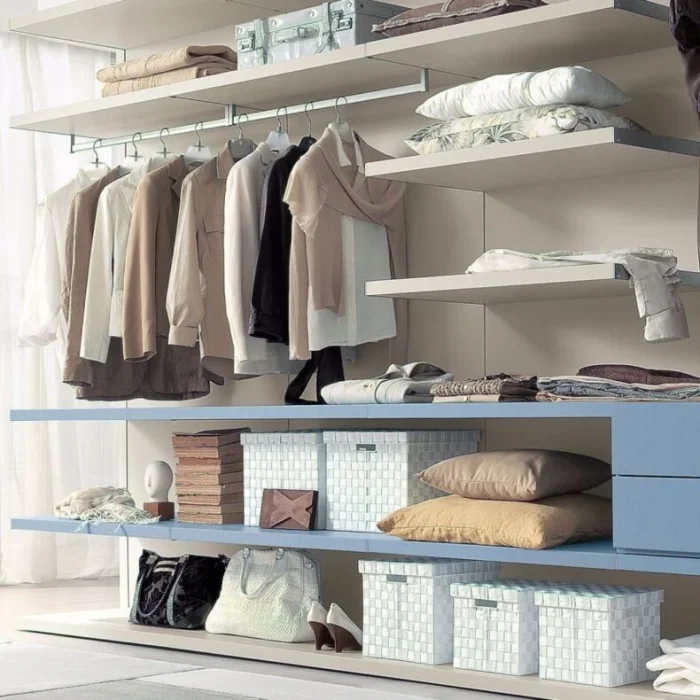 - Открытые стеллажи и полки для всего объемного: коробок с сезонными вещами, сумок, домашнего текстиля. Без фасадов — так все на виду и легче доставать.
