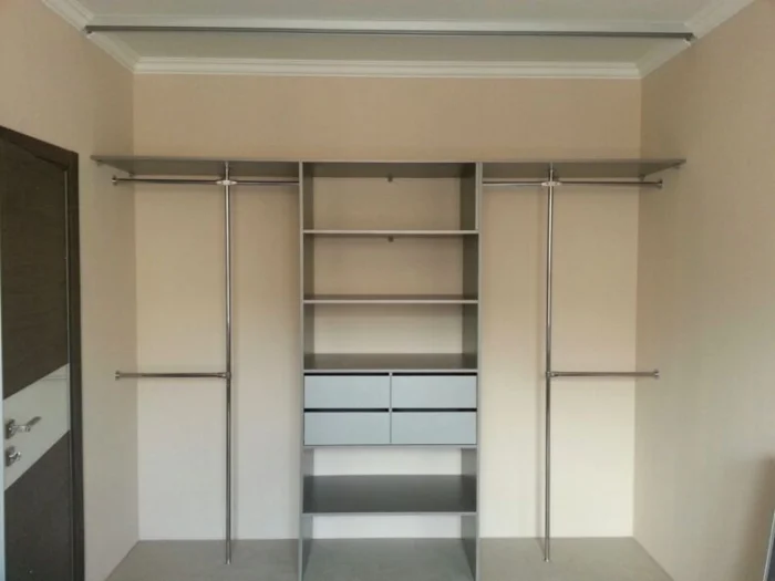 - Монтаж штанг. Крепим горизонтальные трубы для плечиков. Обычно их делают на двух уровнях: для длинной одежды (платья, пальто) и для короткой (рубашки, блузки, пиджаки).