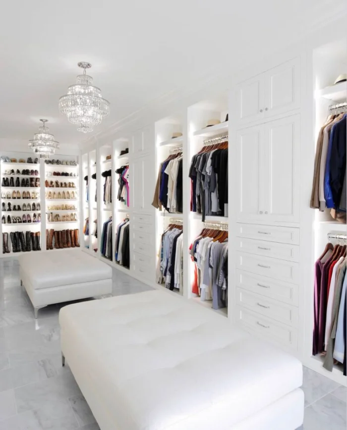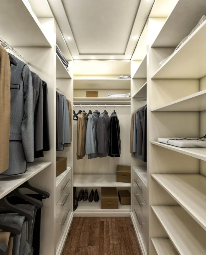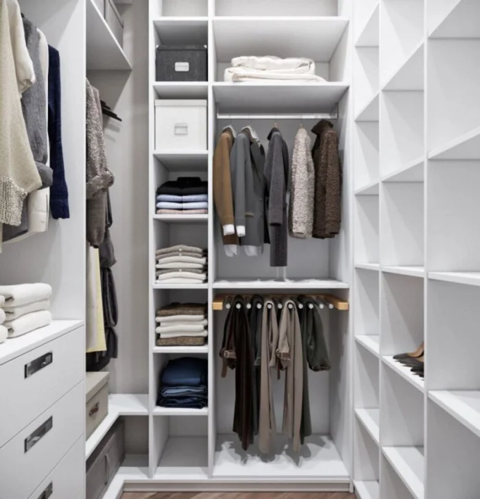 Как должна выглядеть идеальная гардеробная изнутри? Это не склад, а логично организованная система. Классика жанра — линейное расположение систем хранения вдоль стен, чтобы в центре оставался проход. Вот что должно быть внутри: