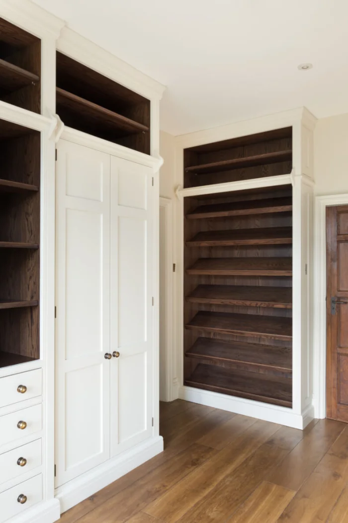 Золотое правило: глубина и высота полок должны соответствовать тому, что на них будет храниться. Нет ничего раздражающее, чем коробка, которая не влезает по глубине на 2 сантиметра.