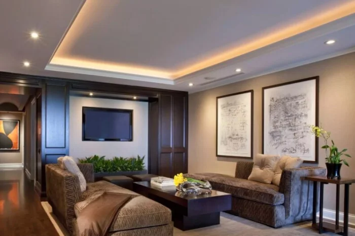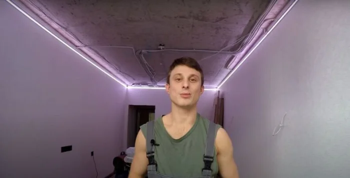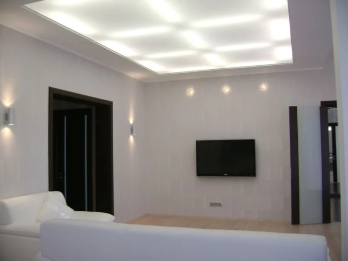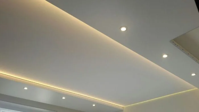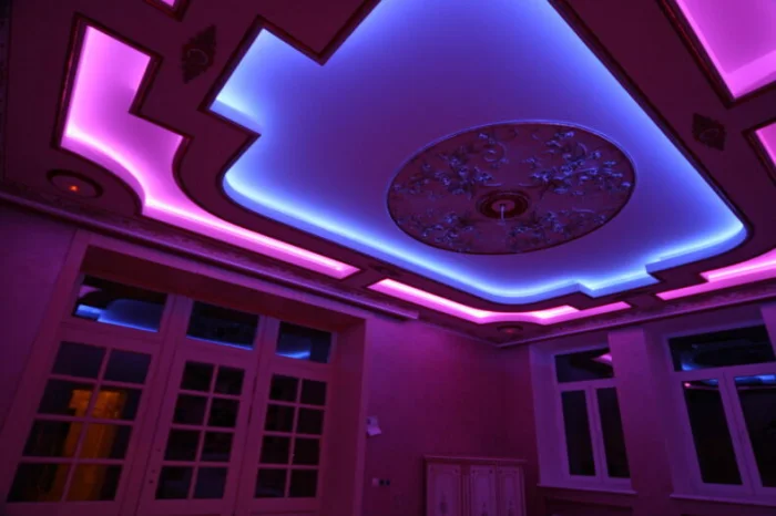 - Многоуровневые конструкции со светодиодной лентой, спрятанной за гипсокартонным бортом;