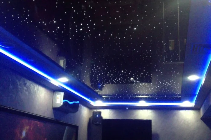Представьте: за темно-синим или черным полотном мерцают сотни крошечных огоньков. Это и есть легендарное «звездное небо». Да, монтаж трудоемкий, но эффект... Эффект заставляет гостей замирать в восхищении.