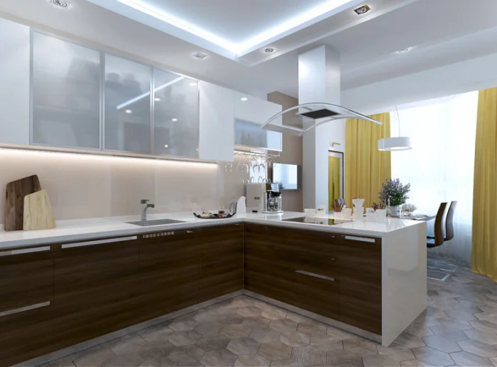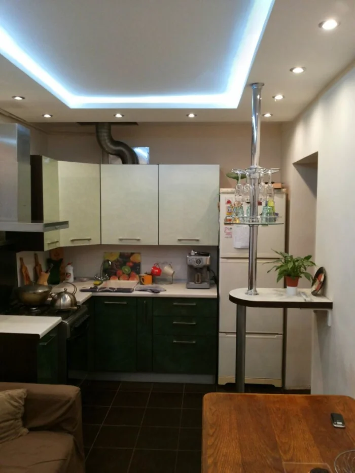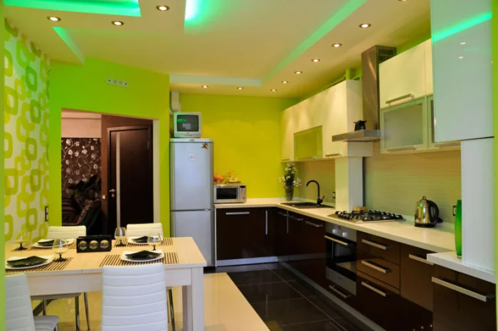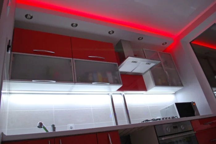 - На кухне без мощной вытяжки не обойтись — жировой налет на полотне не украсит даже самую крутую подсветку.