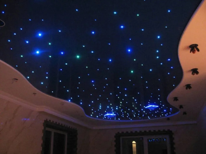 Есть разные подходы к созданию космоса над головой. Бюджетный — полотно с фотопечатью галактики и контурной лентой по краю. Более сложный — оптоволокно, где свет передается по нитям к точкам на потолке. Самый же роскошный вариант использует рассеиватели из хрусталя Swarovski.