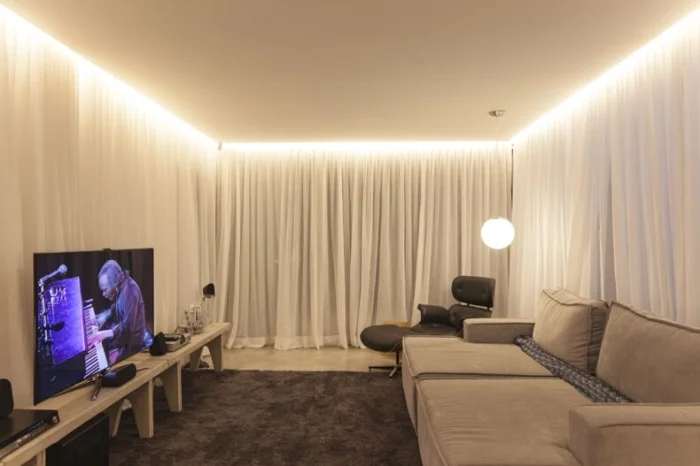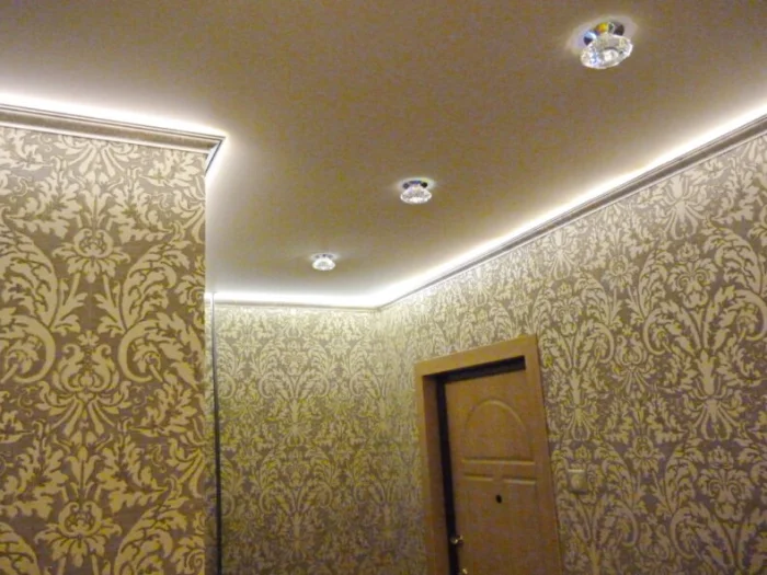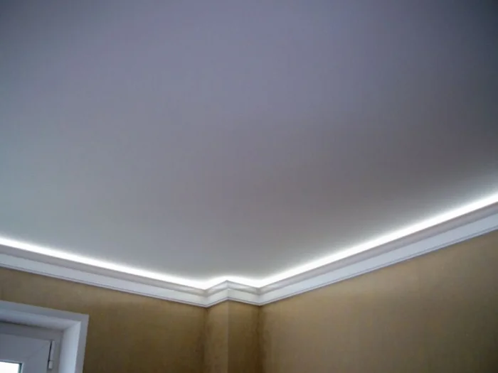 - Простой для самостоятельного монтажа вариант — LED-лента за потолочным карнизом;