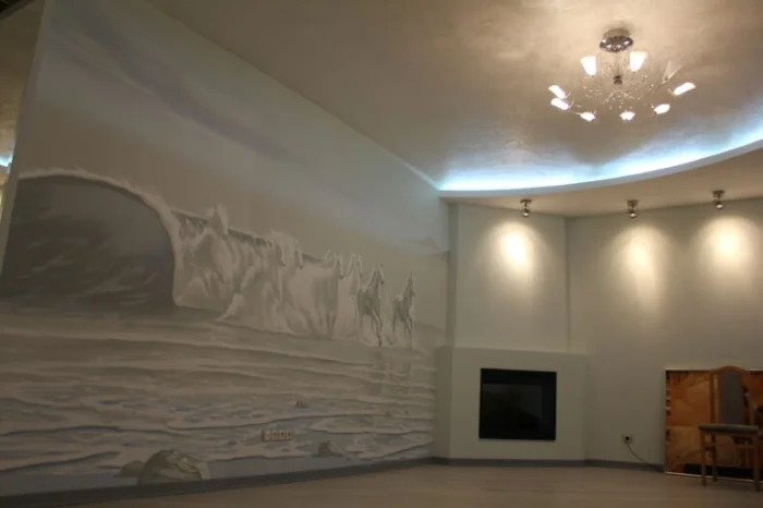 - Полотно с фотопечатью, дополненное точечными спотами;