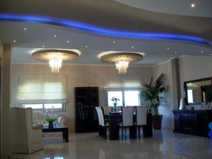 Например, в гостиной-столовой можно выделить обеденную группу другим цветом, фактурой или формой потолочного элемента. Работает безотказно!