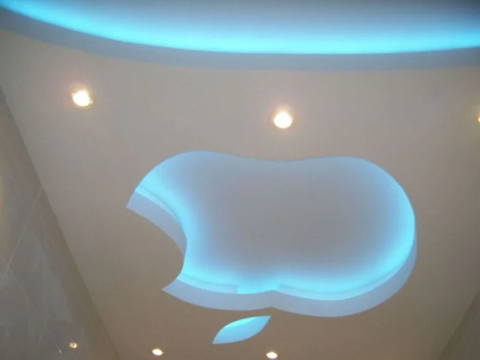 Техника проста: на лист гипсокартона наносится рисунок (например, гипсовой штукатуркой), сушится, а потом монтируется на потолок. Можно оставить белым или раскрасить. Эффект потрясающий даже на одноуровневой конструкции.