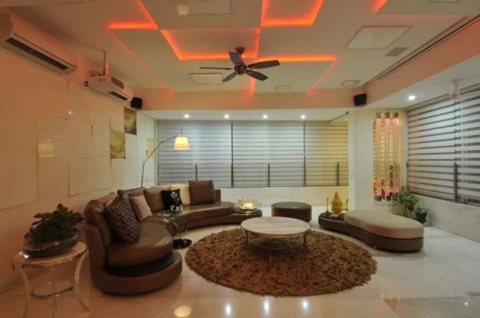 Зону дивана и телевизора легко обозначить потолочной дугой или более ярким светом. Цвет, текстура, уровень — все средства хороши для создания границ без стен.