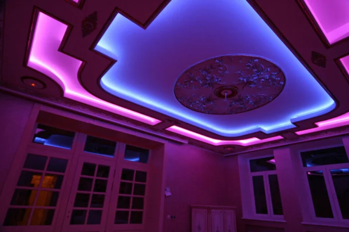 Здесь раздолье для самых смелых идей. Светильники на разных ярусах, подсветка разных цветов, сложные переходы — все это создает неповторимую динамику.