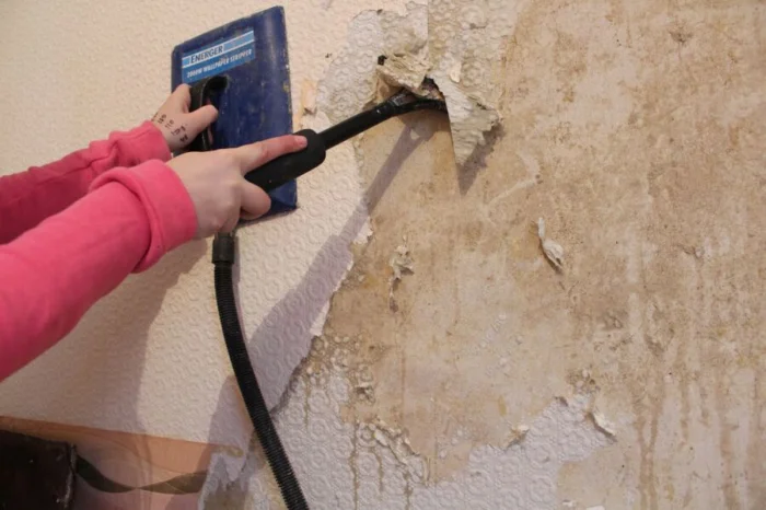 Элегантный и эффективный метод. Парогенератор (или мощный отпариватель) направляют на стену. Горячий пар за секунды проникает вглубь, размягчая самый стойкий клей.