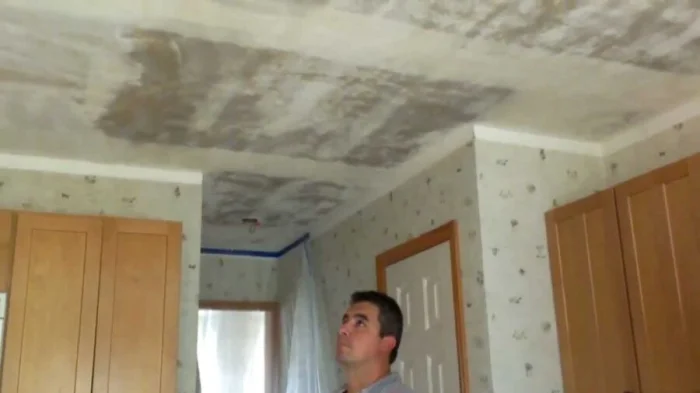 Тут нужна сноровка и подготовка. Из инструментов — стремянка, широкий шпатель, валик, плёнка для пола и средства защиты (очки, кепка — мусор будет сыпаться прямо на вас).