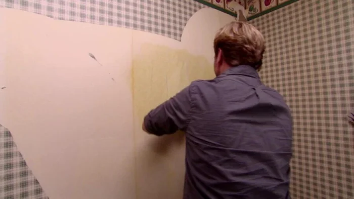 Смочите стену губкой, валиком или пульверизатором. Дайте «настоятся» 15-30 минут. Затем подденьте край шпателем и снимайте. Начинайте от стыков полотен. Работайте небольшими участками, не давая им высыхать.