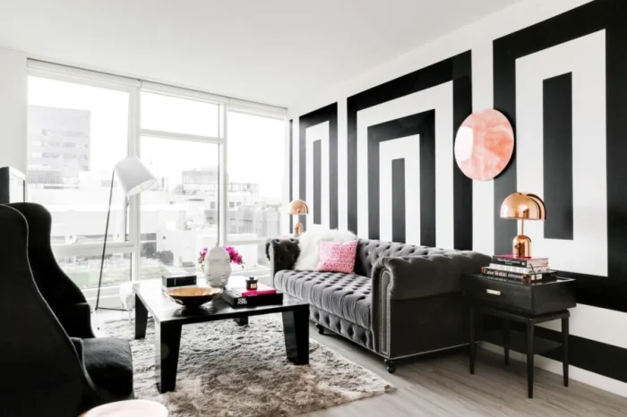 - Горизонтальные полосы. Растягивают стену вширь, делают потолок визуально ниже. Создают ощущение стабильности, основательности. Идеально для классических интерьеров.