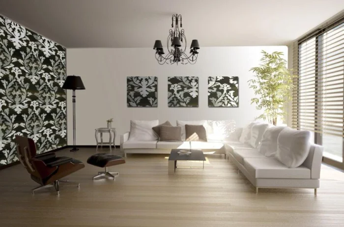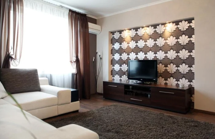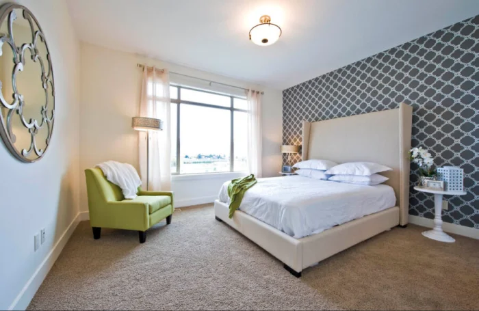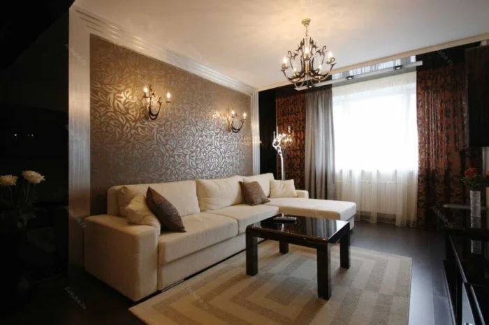 - Сохраняйте баланс. Если на акцентной стене сложный динамичный узор, мебель рядом должна быть максимально простой.