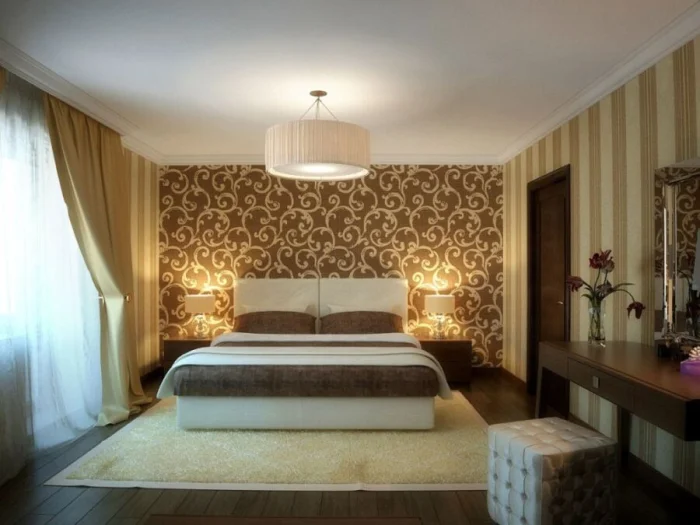 Вставки из контрастных обоев в изголовье кровати, обрамлённые молдингами, — приём для создания роскошной, «дорогой» атмосферы.