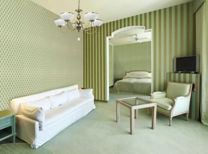 - Вертикальные полосы. Наш главный союзник в борьбе с низкими потолками! Они буквально «поднимают» помещение. Чаще всего их клеят по схеме «одна через одну» или «две через одну».