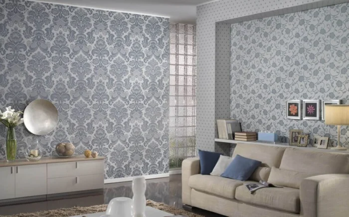 - Однотонный фон + узор. Вечная классика. Спокойная стена и стена с характером.