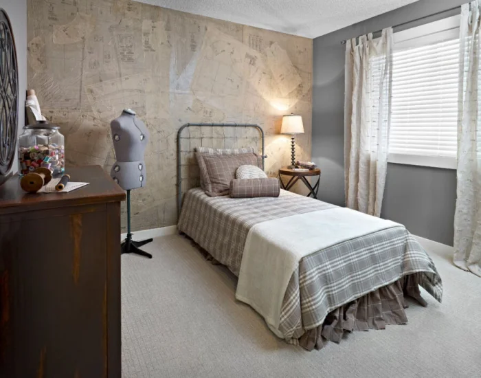 Начинайте с пастельной гаммы и геометричных лоскутов одного размера (например, квадраты 50x50 см). Мебель в такой спальне должна быть максимально простой и однотонной.