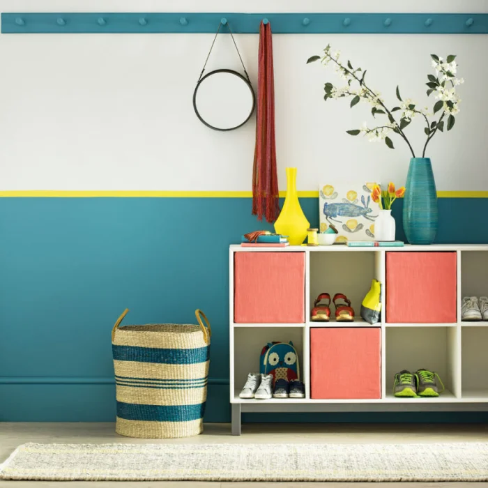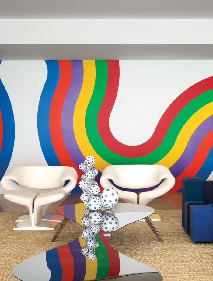 Для плавного перехода между цветами используйте нейтральную буферную зону — например, стену с мелким абстрактным узором между двумя однотонными плоскостями.