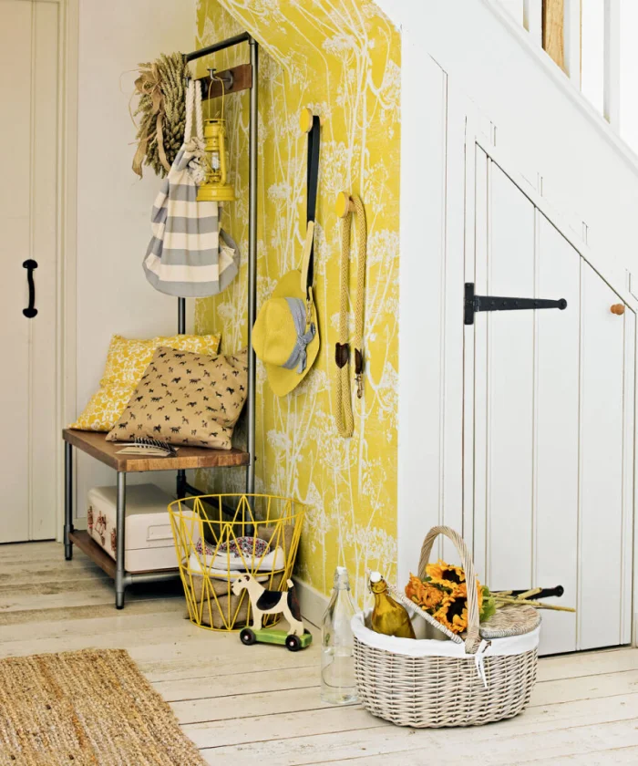Цвета в прихожей должны перекликаться с остальными комнатами. Чтобы сделать узкий коридор шире, используйте горизонтальные широкие полосы светлых оттенков. Узкие вертикальные полоски, наоборот, его «сожмут».