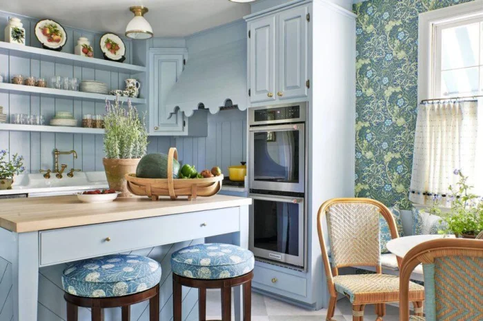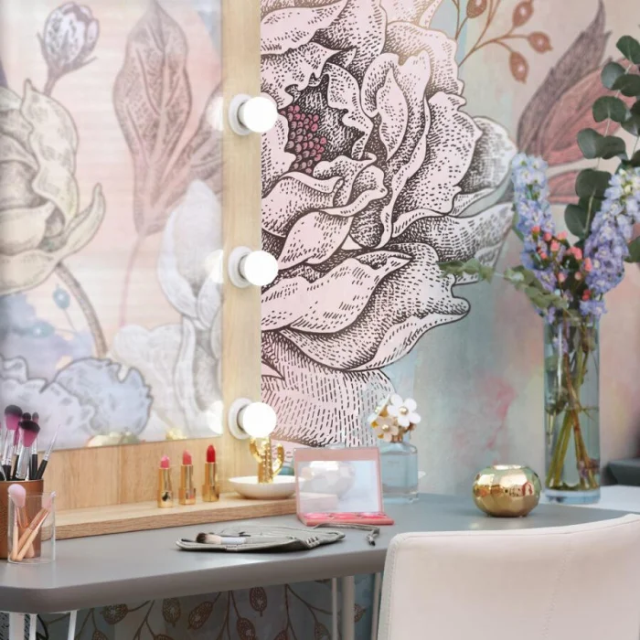 Цветочные принты — душа классики, прованса, шебби-шика. Их часто сочетают с однотонными стенами или текстурой «под дерево». Вариантов комбинации рисунка масса: