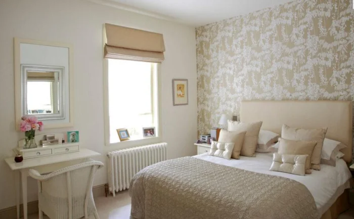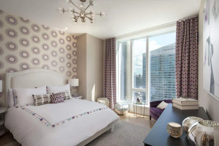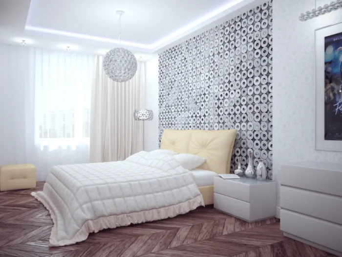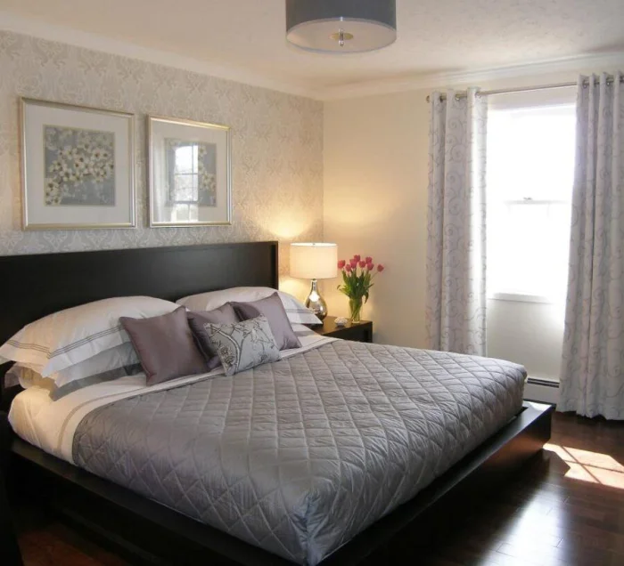 Здесь главный принцип — не перегрузить. Для спальни выбирайте нейтральный фон, а акцент сделайте только в изголовье кровати (флористика, абстракция, мягкие фотообои). Яркий крупный рисунок напротив кровати может мешать расслаблению, но это вопрос личных предпочтений. В любом маленьком помещении верные друзья — пастельная гамма и вертикальные полосы для высоты.