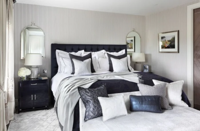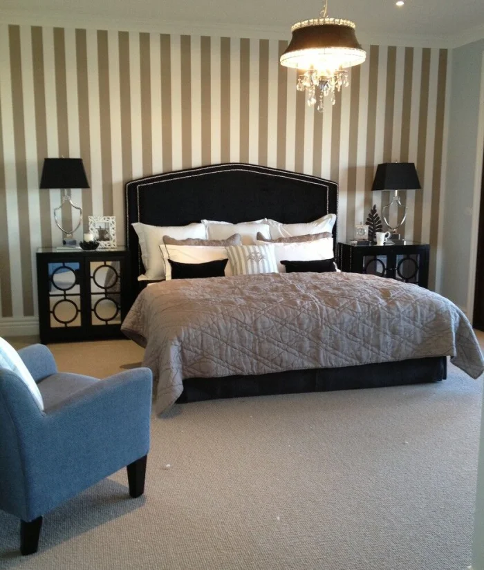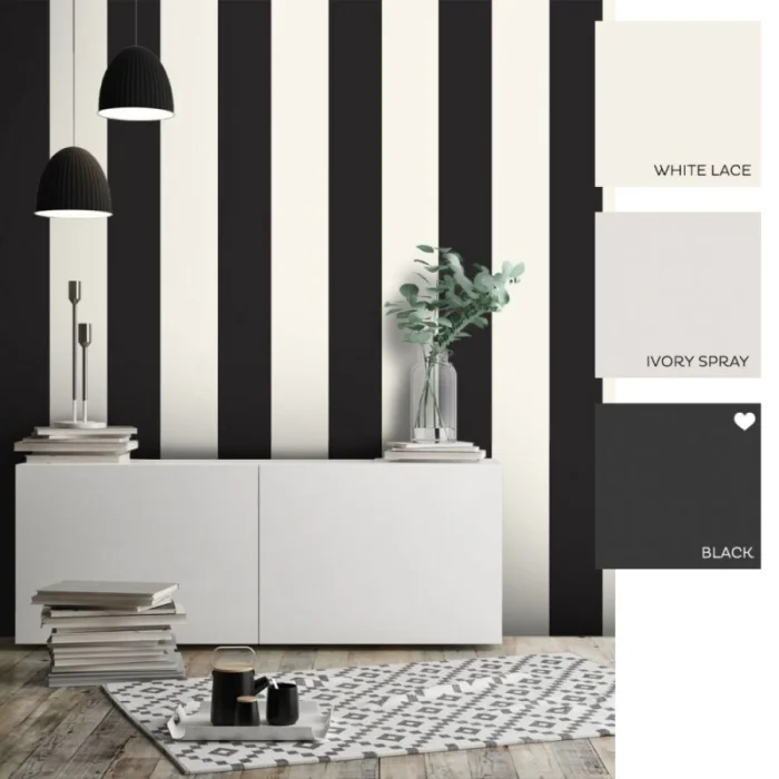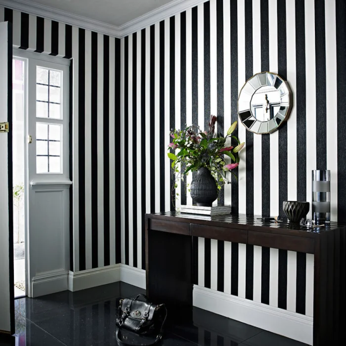 - Чёрные полоски — строгость и безупречность. Требуют ярких цветовых пятен в декоре, иначе комната станет мрачной.