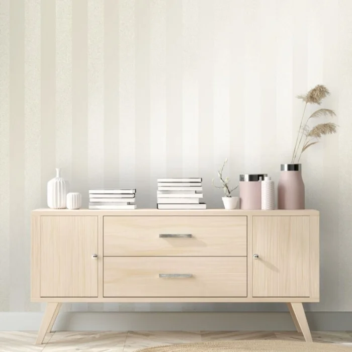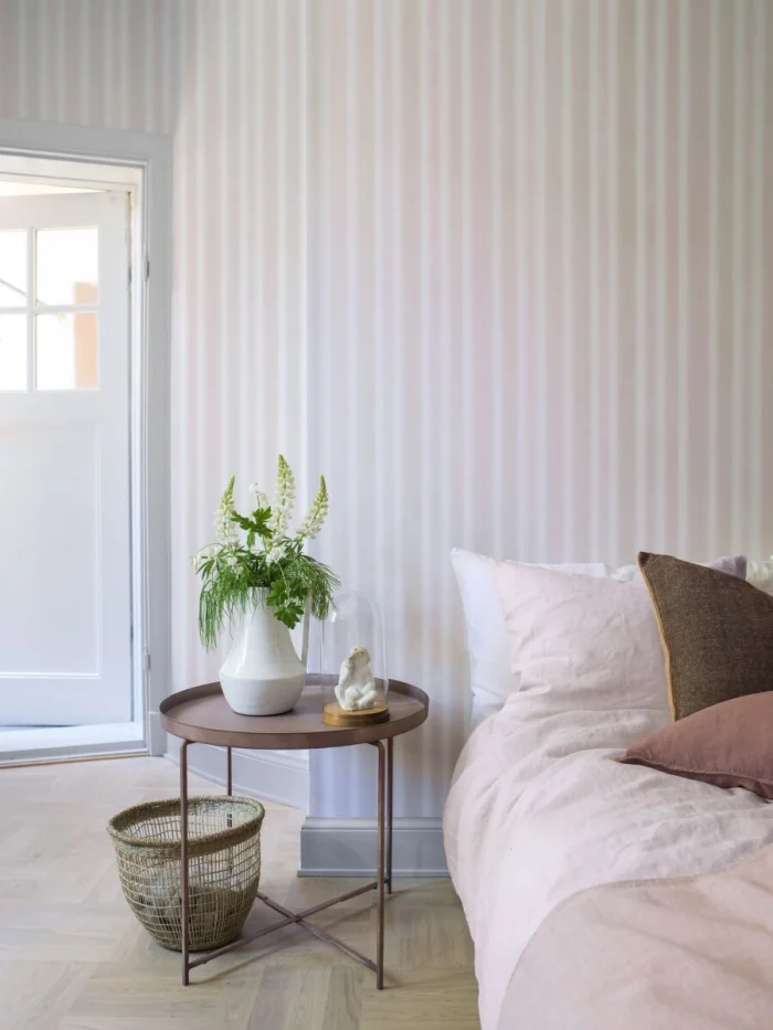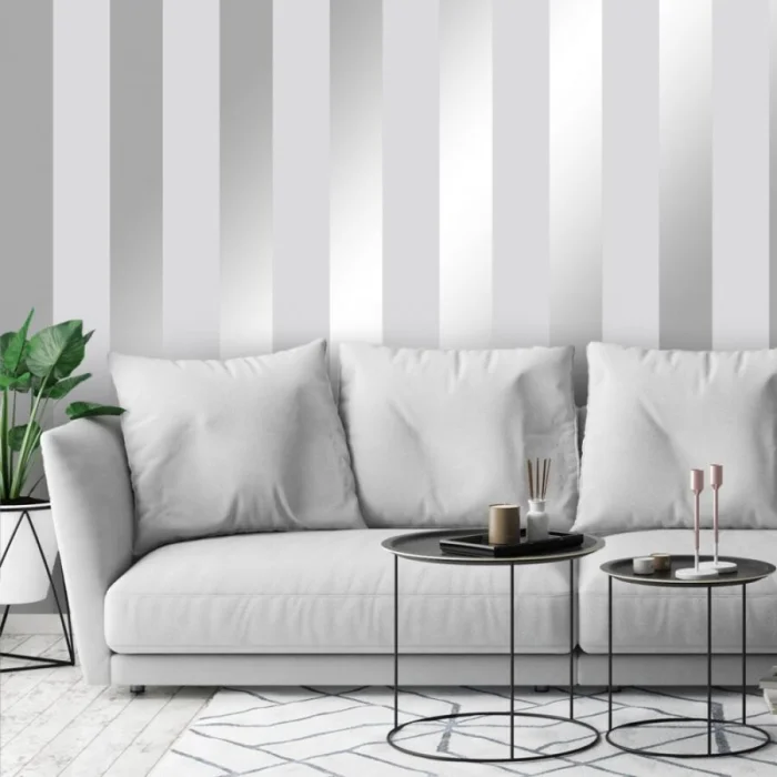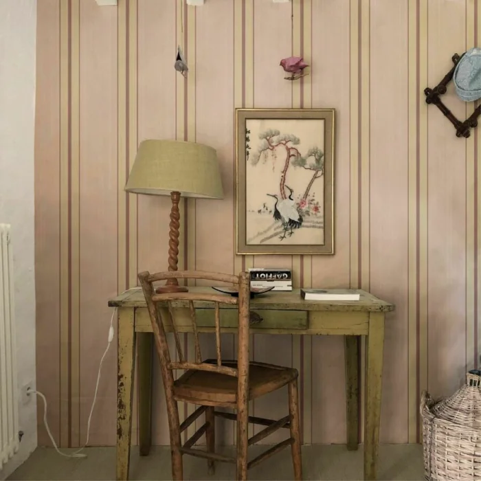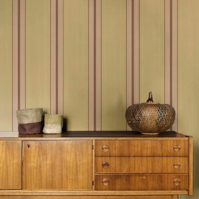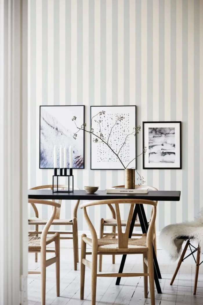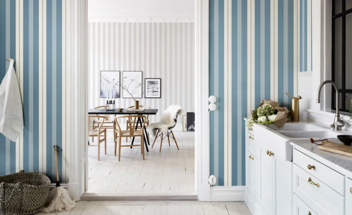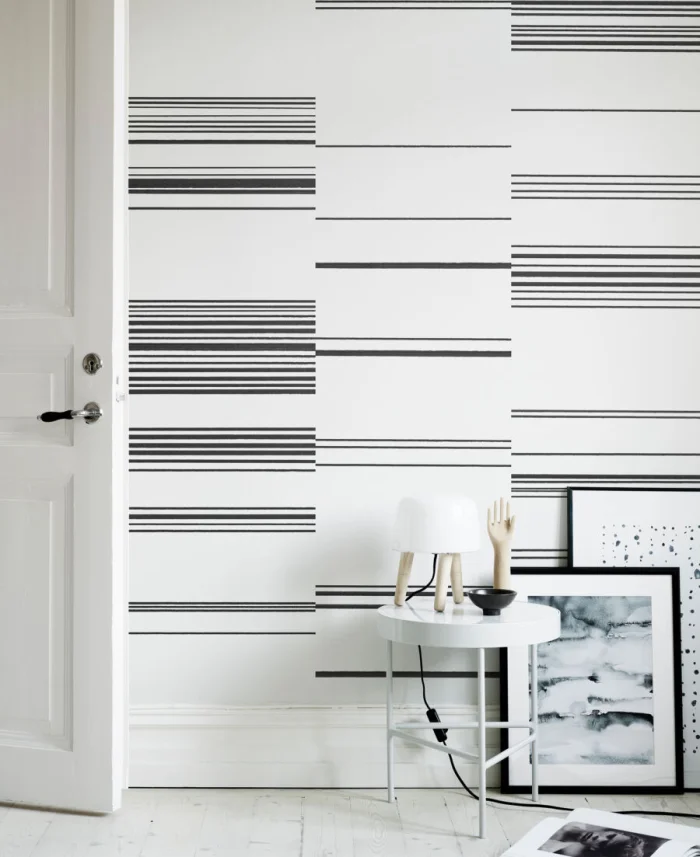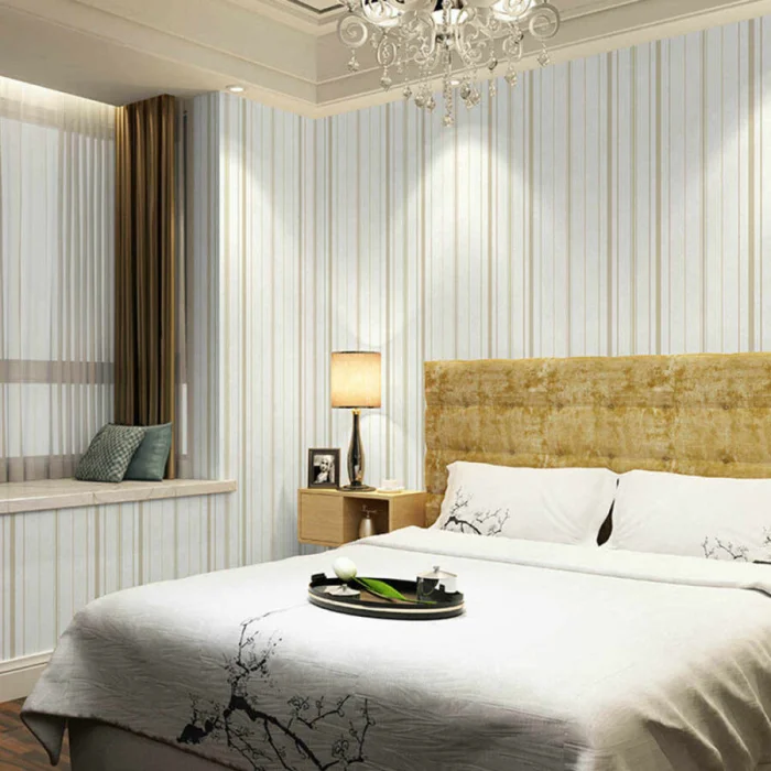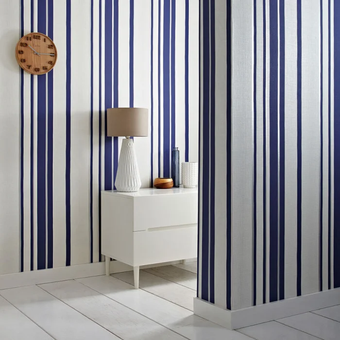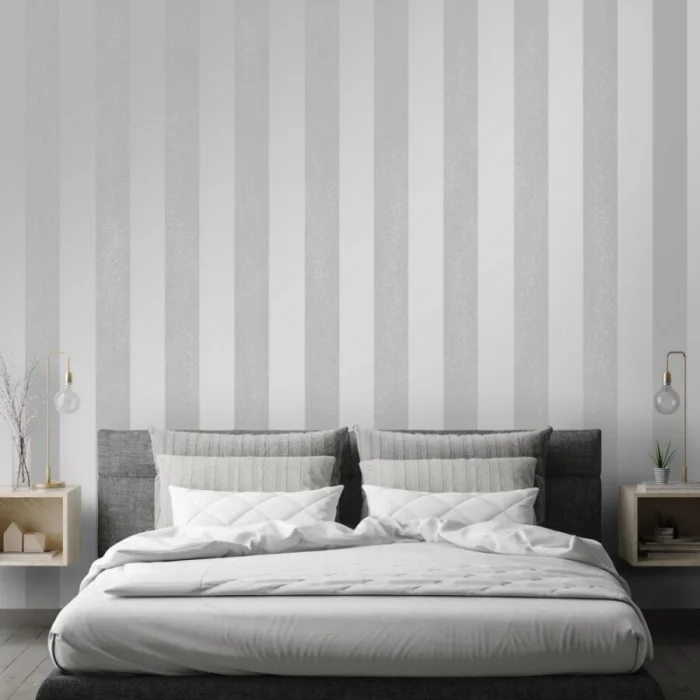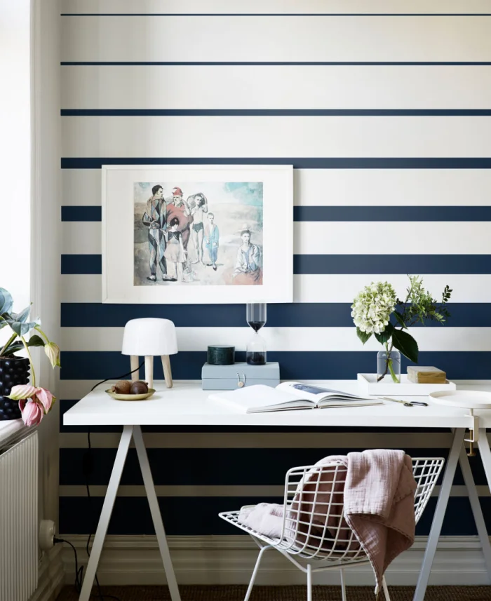 А вот с узкими полосками — история иная. Частый, динамичный ритм. Он может будоражить, а может и утомлять, если оклеить все стены. Поэтому тонкую полоску лучше использовать дозированно — например, выделить одну акцентную стену. Иначе есть риск получить эффект визуальной «дрожи».