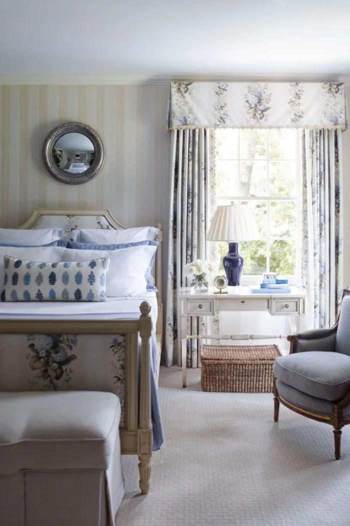 - Белые полоски (особенно на светлом фоне) — чистота и воздушность. Отлично «расширяют» маленькие комнаты. Синие полоски на белом — гимн спокойствию для спальни.