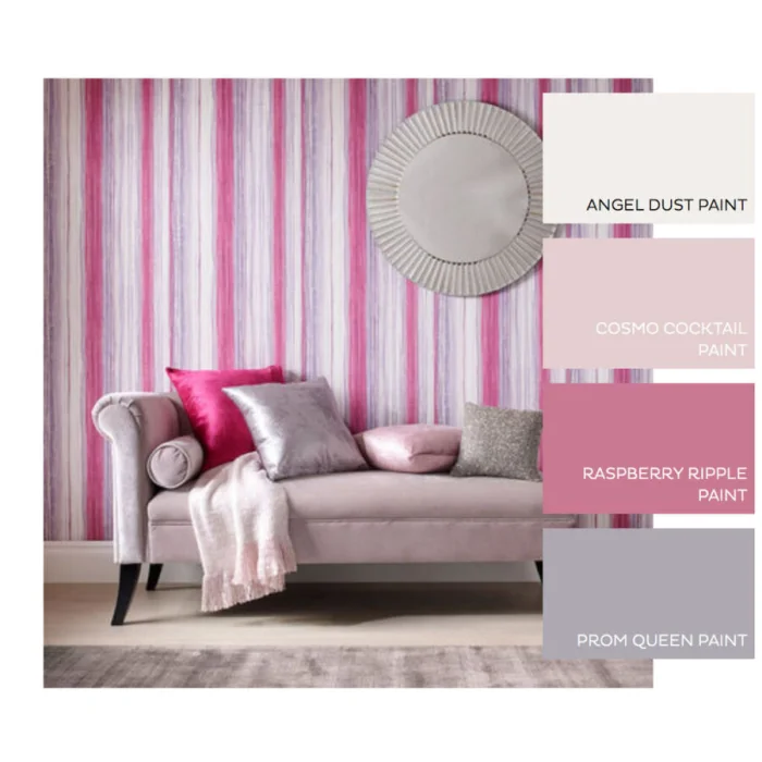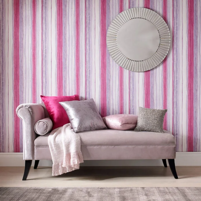 - Сиреневые полоски — мечтательность. Хороши в просторных комнатах на лимонном, сером или розовом фоне.